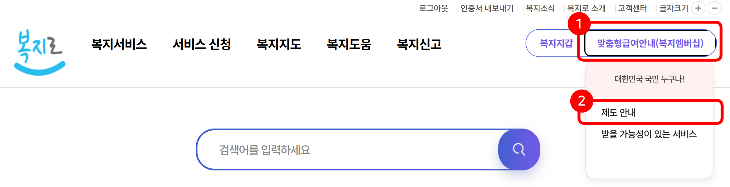 복지로 홈페이지에 접속하면 아래와 같은 화면이 나옵니다. 1번 맞춤형급여안내(복지멤버십) 버튼을 누르고 팝업 메뉴가 열리면 2번 제도 안내를 누릅니다.