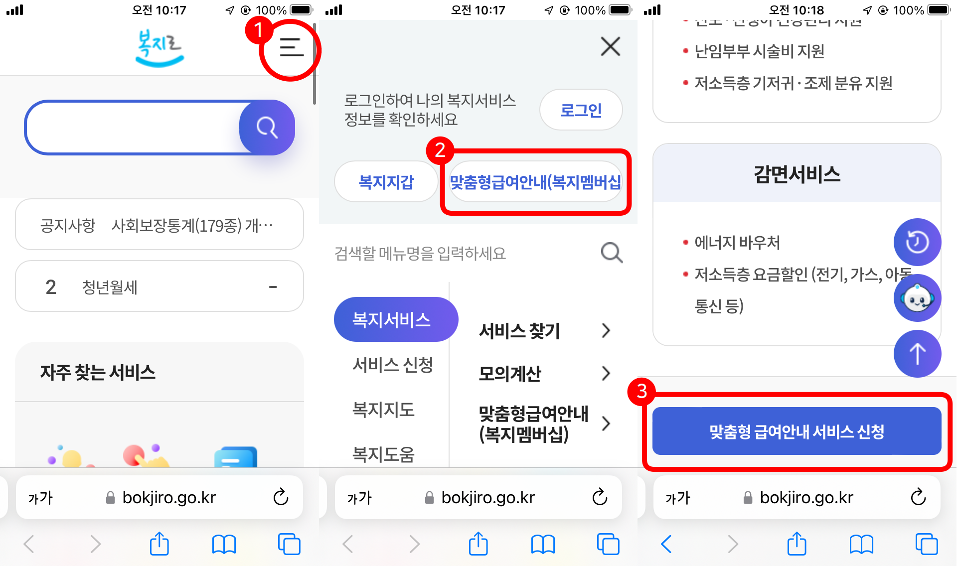 복지로 홈페이지에 접속합니다. 1번 우측 상단 메뉴를 누릅니다. 2번 맞춤형급여안내(복지멤버십)를 누른 후, 제도안내를 누릅니다. 제도 안내 페이지의 내용을 확인하신 후 3번 맞춤형 급여안내 서비스 신청을 눌러서 신청합니다.