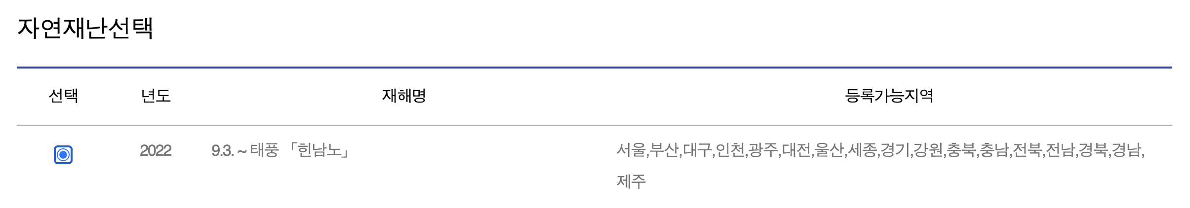 자연재난선택 목록에서 2022년도 9.3. ~ 태풍 힌남노를 선택합니다. 표 오른쪽에는 등록가능지역이 나오니 확인하시고 신청하시면 됩니다.